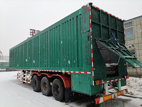Our company always adheres to our business idea of technological innovation. By virtue of our keen market insight and innovative spirit, we invested a great deal of manpower and material resources in product development and research, which involved experiments on hundreds of vehicles over the past years. In 2018, we successfully developed our patented product: Intelligent Crawler-type Dump Truck. The length of its container is settable and ranges from 8 to 13 meters; the height ranges from 1.8 to 2.4 meters; the outer width is 2.55 meters; and the inner width is 2.45 meters. Of course, it can also be customized in accordance with the customer’s special requirements. This patented dump truck is compatible with tractors of various brands, tractors of the same tonnage or similar vehicles to constitute a tractor-trailer combination, which is applicable to transportation of bulk goods like household waste, sand and stones, coal, grain and salt. This patented dump truck integrates advantages of both common rear dump trucks (e.g. fast unloading) and side dump trucks (e.g. higher loading capacity), but gets rid of their disadvantages (for example, it is easy for rear dump trucks to turn over; tires of side dump trucks are likely to be buried in falling goods; it is easy for side dump trucks to have a flat tire; and it is easy for their side baffle to deform). Moreover, our dump truck features a high safety factor, advanced processing techniques, lightweight, high automation, simple operations, high reliability, high cost-efficiency and durability. It achieves truly steady unloading, which is not achieved by other dump trucks at home and abroad. Its intelligent transfer and automatic unloading mode ensures that it will never turn over. Thus, both it and its driver will be sound and safe. The driver can remotely control its hydraulic operation system through its video monitoring system. Thus, the driver can finish unloading without getting off the truck. This significantly reduces the driver’s labor intensity. It only takes 5-10 minutes to unload the whole container of goods. In particular, the hydraulic automatic flipping device mounted in the container can lift hydraulic rams on the two sides to vibrate to unload goods if it’s difficult to unload the remains of goods. This ensures that even materials of high viscosity can be unloaded with ease, and that remains of goods will never be left in the container. In addition to its high unloading efficiency, it achieves the goal of “lighter body but more goods”, which other similar vehicles fail to achieve. At present, more than 90% of 13-meter trailers, which carry bulk goods like coal, sand and stones and grain on the road in China, are illegally refitted or have fake number plates. Thus, our patented dump truck is of great practical significance as China’s authorities in the transportation industry strive to govern oversize or overweight goods transportation.