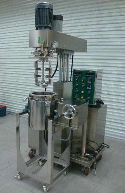 此机台配备有正转均质机、逆转刮边搅拌、抽真空及加热功能,搅拌桶槽亦可倾斜倒料。
