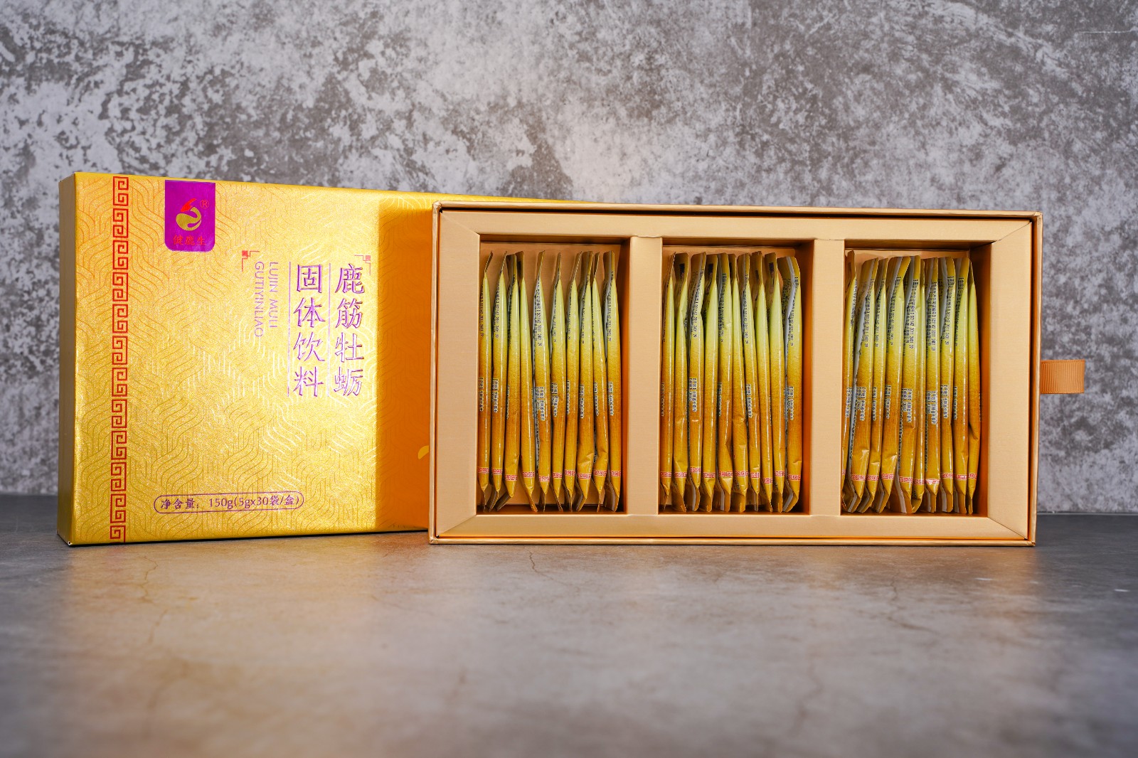 主要原料:麦芽糊精、鹿筋、牡蛎、枸杞、桑椹、葡萄糖酸钙、菊粉、甜菊糖苷等