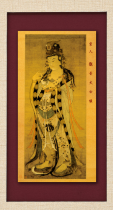 觀音菩薩身著 華麗錦衣,披配各式瓔珞,藍色的長髮垂肩,首戴莊嚴寶冠,冠中安置一尊阿彌陀佛像。一手執柳枝,一手持透明玻璃水杯。足踏青、白蓮花各一,款步而行,衣帶飄揚。其容貌寧和,狀甚安詳。觀音是阿彌陀佛的脇侍,彌陀入滅後,觀音也將成佛補其儲位,因此觀音寶冠中,往往安置彌陀入定像,水杯或淨瓶中盛甘露,喻滌除眾生無明塵垢。柳枝則代表觀音拔苦濟難的特質。本院舊有的典藏目錄稱,這是一幅宋代畫家的作品。