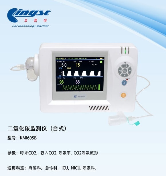 测量参数:呼末二氧化碳、呼吸频率及实时二氧化碳反映曲线适用环境:院前检测、转运检测、急救及CPR监测、急诊科、手术室、重症监护、新生儿监护、睡眠监护技术参数:电源交流输入 220V, 50Hz正常工作条件 环境温度5-40°C 。