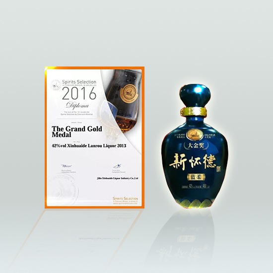 2016年吉林省新怀德酒业有限公司的产品摘得“比利时布鲁塞尔国际烈性酒大奖赛”中国参赛产品唯一一块大金奖