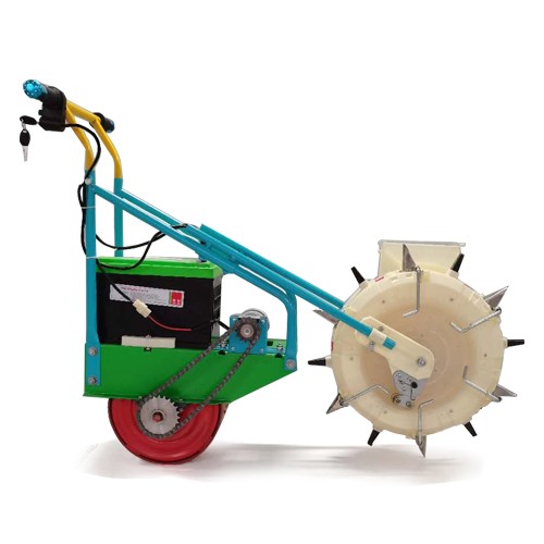 配合播种机作业,该产品适应在耕作后的土壤上作业,可更换任意 播种机,其原理是农业播种后需要轻轻镇压,使种子与土壤紧密接 触,营造适合种子生长发育的环境,才更有利于提高种子发芽率。 本产品运用电启动方式,配合播种机使用,播种后直接镇压,体型 小,操作简单,一学就会,电池可充电。