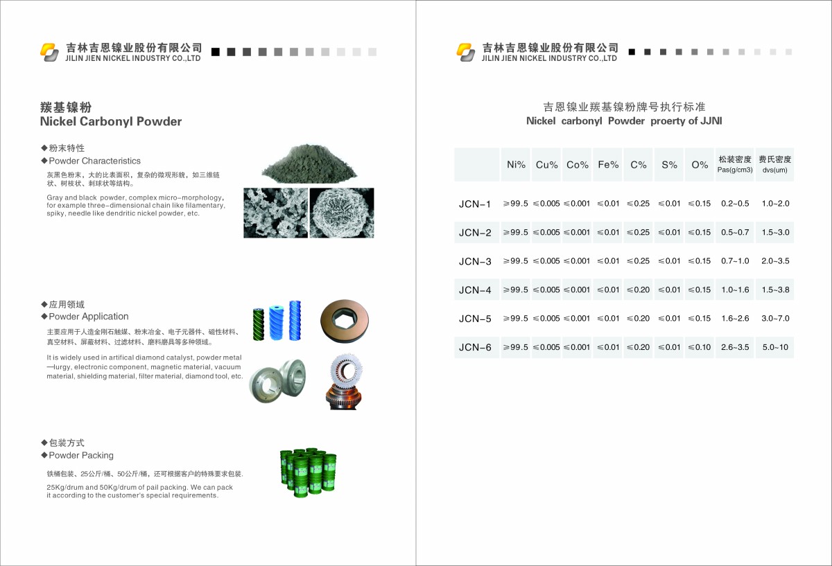 广泛应用于镍-镉、镍-氢电池,过滤器、军工、高密度和高熔点材料的粘结剂、粉末冶金添加剂、精密合金、特种钢、不锈钢焊条、石化用催化剂和新型化合物、电子显象管用吸气剂、高频或超高频磁性材料等。