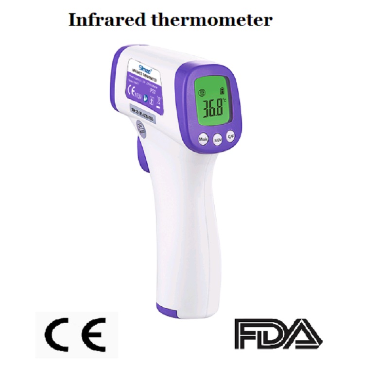 红外额头体温计,又叫非接触式电子温度计。通过非接触式的方式测量温度。由感温探头,主机体,显示屏,电池盖和电源组成。本产品具有CE证书,FDA证书,SGS检测,ISO认证等证书。 包装是60个/CTN,外箱尺寸47*35*32cm,毛重7.4kgs/ctn。